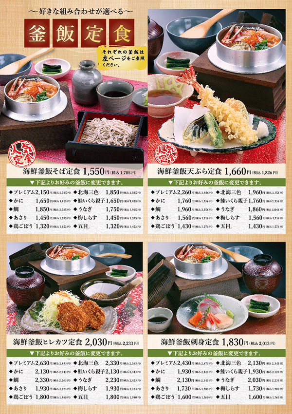 釜飯・寿司・刺身・天ぷら・そば・とんかつ・お子様メニューなど豊富なメニューでお待ちしております。お祝い・法事・慶事・各種ご宴会承ります。